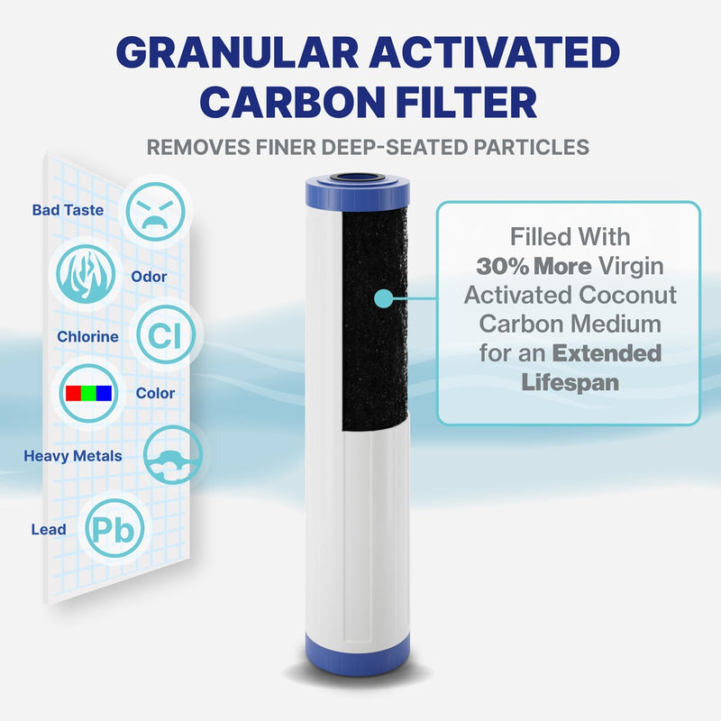 Each system offers 20" tall, heavy duty filters that can withstand huge volumes of water and its contaminants. That means you'll filter all the water your home needs without worry about leaks or breaks, ensuring maximum clean water output and filteration.