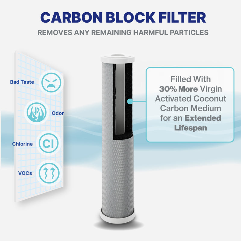 Finally, water passes through the Carbon Block Filter to remove chlorine, VOCs, organic chemicals, mercury, giardia, cryptosporidium, manganese, bad taste, and odor before leaving the tap.