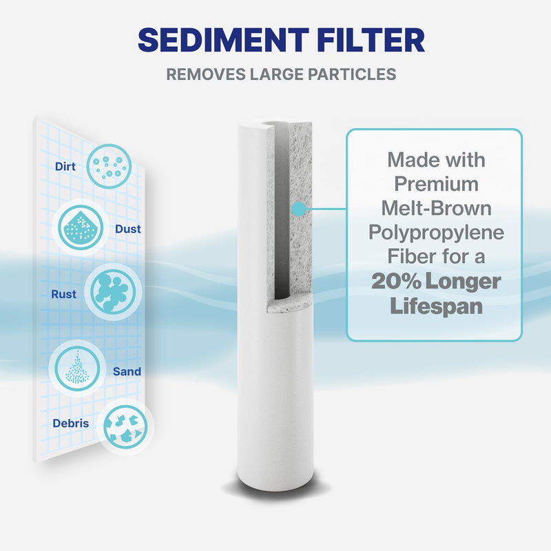 Toxin-filled water enters the Sediment Filter to remove dirt, sand, dust, rust, and debris.